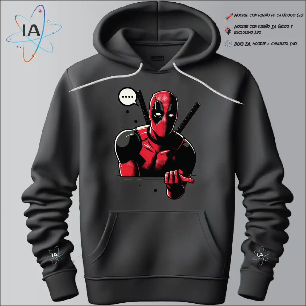 ¡Prepárate para lucir increíble con nuestra hoodie de Deadpool! ¿Qué hace a esta sudadera tan especial? Sus estampados exclusivos, creados por nuestra avanzada inteligencia artificial. Cada diseño es único y está pensado para los verdaderos fans del mercenario bocazas.