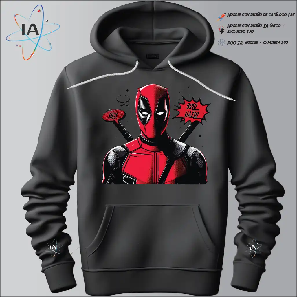 ¡Prepárate para lucir increíble con nuestra hoodie de Deadpool! ¿Qué hace a esta sudadera tan especial? Sus estampados exclusivos, creados por nuestra avanzada inteligencia artificial. Cada diseño es único y está pensado para los verdaderos fans del mercenario bocazas.